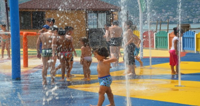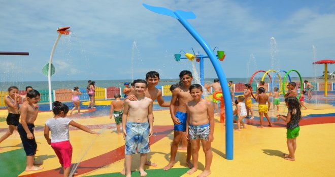 Çocuklar ise su oyun parkında çeşitli oyuncaklarla oynayarak hem serinliyor hem de güzel ve eğlenceli vakit geçiriyor.