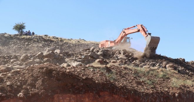 İş makinesi 50 metrelik çukuru, yerleşim yerindeki taşlarla kapatıyor