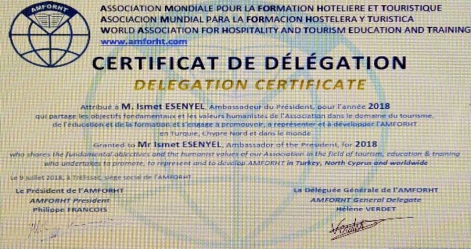 Merkezi Fransada bulunan kısa adı AMFORHT olan Dünya Turizm Eğitimi ve Konaklama Birliği Teşkilatı; KKTC Turizm ve Çevre Bakanlığı Müsteşarı, aynı zamanda Girne Amerikan Üniversitesi, Konaklama ve Turizm Meslek Yüksek Okulu Öğretim Üyesi olan Doç. Dr. İsmet Esenyeli teşkilatın elçisi olarak atadı.