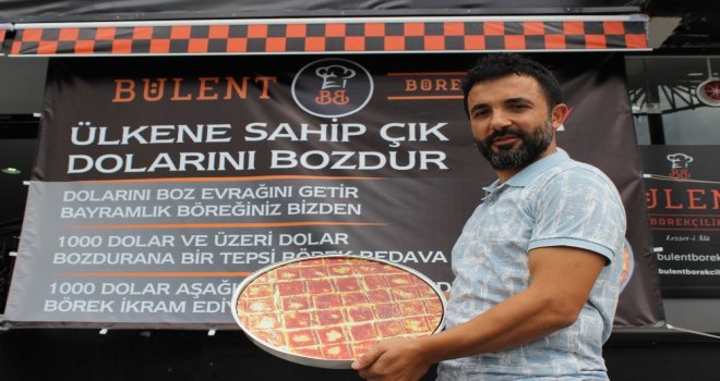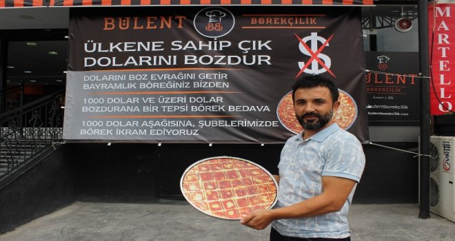Cumhurbaşkanı Erdoğanın “Dolar bozdurun” çağrısına destek veren bir börekçi işletmesi, dolar bozduran vatandaşlara börek ikramı kampanyası başlattı. Kampanya dahilinde dolar bozdurup makbuzuyla gelen her vatandaşa börek ikram edildi.
