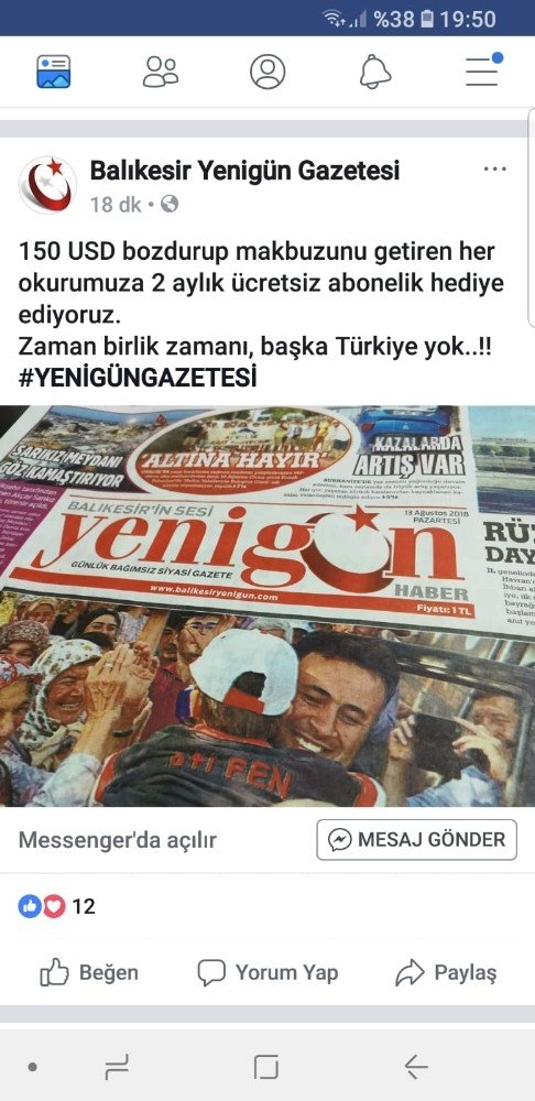 Balıkesir günlük olarak faaliyet gösteren Yenigün Gazetesi İmtiyaz Sahibi Levent Uysal, Cumhurbaşkanı Recep Tayyip Erdoğanın döviz bozdurma çağrısına uyarak 150 dolar bozduran vatandaşların 2 ay süreyle ücretsiz gazete aboneliği sağlayacaklarını belirtti. Leven Uysal yaptığı açıklamada “Bu coğrafyanın tarihine bakın, ne zaman bir işgal hareketi olsa ne zaman bu topraklar tehdit edilse Balıkesirde yaşayanlar hemen reaksiyon gösterir. 41 Bayrak Adam sahne alması, Kurtuluş Savaşında ilk Kuvayı Milliye direnişinin buralardan başlaması tesadüfü değildir. Bugün yaşadıklarımızın, geçmişte bize dayatılanlardan hiç bir farkı yok. Görünürde bir papazı önümüze süren müttefikimiz ve NATOdan ortağımız ABD, milli egemenliği ve menfaatleri doğrultusunda adımlar atan Türkiyeye akla mantığa sığmaz yaptırım ve tehditler etmeye başladı. Kendini bilmez çılgın bir Evangalist, 3 kişinin bir araya gelip devlet kurduğu Türk Milletine atar yapmaya kalktı. Elbette ülkenin ekonomi kurmayları, tamamen zorbalık olan gümrük vergisi ve kur darbesine karşı gerekli tedbirleri alacaklar ve devlet dili ile gereğini yapacaklardır. Yenigün olarak bizim yaptığımız karınca misali safımızı belli etme ve mazlumların son umudu Başkanımız Tayyip Erdoğanın yanında olduğumuz ilan etmektir. Bu kampanyayı da farkındalık meydana getirmek adına başlattık”dedi.