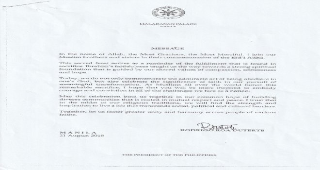 Müslüman Filipinliler Milli Komisyonunu aracılığıyla Devlet Başkanı Rodrigo Duterte Kurban Bayramı mesajında, “Salı günü başlayacak Kurban Bayramının, millet olarak karşılaştığımız tüm zorluklar için cesaret ve inanca sebep olmasını umut ediyorum” dedi. Duterte, “Bu bayram, karşılıklı sevgi ve barış içinde sağlam topluluklar inşa etme konusundaki ortak umutla bizi bir araya getirebilir. Dini geleneklerimizin merkezine güvenin, sosyal, politik ve kültürel engelleri aşan bir hayatın koyulması için güç ve ilham bulacağız” ifadelerini kullandı.