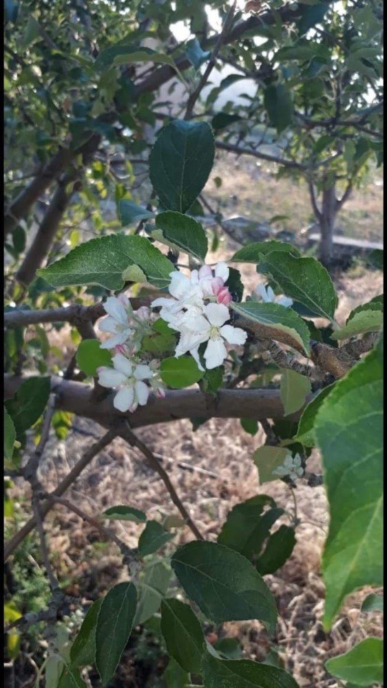 Malatyanın Hekimhan ilçesinde, bir elma ağacının meyve zamanında yeniden çiçek açması, görenlerin şaşırtıyor.