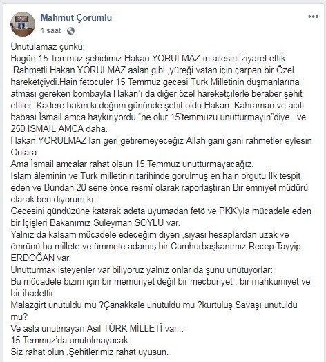 Fetullahçı terör örgütü (FETÖ) tarafından 15 Temmuz gecesinde şahadet şerbetini içen şehit Hakan Yorulmazın babası İsmail Yorulmazı ziyaret ettiklerine değinen Çorumlu, Rahmetli Hakan Yorulmaz aslan gibiydi. Yüreği vatan için çarpan bir Özel Harekatçıydı. Hain FETÖcüler 15 Temmuz gecesi Türk milletinin düşmanlarına atması gereken bombayla Hakanı da diğer Özel Harekatçılarla beraber şehit ettiler. Kadere bakın ki, Hakan doğum gününde şehit oldu. Kahraman ve acılı babası İsmail amca haykırıyordu ‘Ne olur, 15 Temmuzu unutturmayın diye. Allah gani gani rahmetler eylesin onlara. Ama İsmail amcalar rahat olsun. 15 Temmuzu unutturmayacağız ifadelerini kullandı.