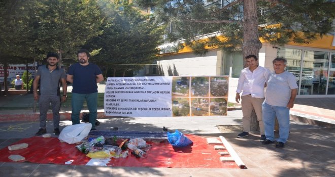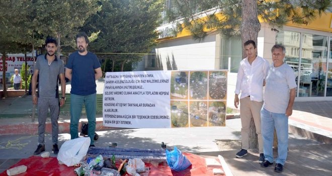 Tekirdağın Çerkezköy ilçesinde duyarlı vatandaşlar parktan topladıkları çöpleri belediye meydanında sergiledi. Çöp sergisinde açılan pankarttaki yazılar da ilgi odağı oldu.