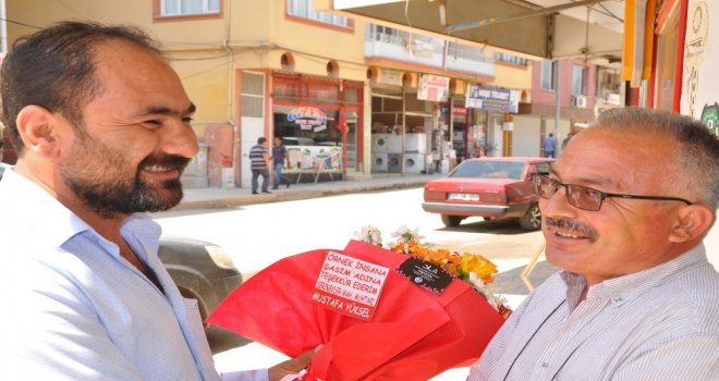 Mahalle Muhtarı Muhtar Yüksel, taksici Koyuncuya çiçek takdim etti.