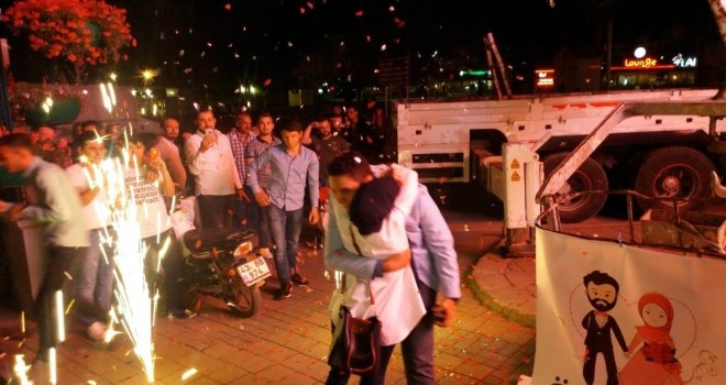 Mimar Tahsin Görkem Lekesiz (29), öğretmen olan kız arkadaşı Nazlıcan Aydemire (25) evlilik teklif etmek için Zafer Meydanında sürpriz hazırladı. Kiraladığı vinci meydanına yerleştiren Lekesiz, vincin sepetiyle metrelerce yükseğe çıktı. Arkadaşlarıyla meydana gelen Nazlıcan Aydemir, Lekesiz ile çekilmiş fotoğraflarının meydandaki dev ekrana yansıtılması üzerine şaşkınlık yaşadı. Ekrana Yukarıya bak yazısı düştükten sonra, Ömrüme ömür olur musun? pankartı açan genç mimer, vinç sepetiyle alana indi. Lekesiz, daha sonra kız arkadaşına havai fişekler ve canlı müzik eşliğinde evlenme teklifinde bulundu.