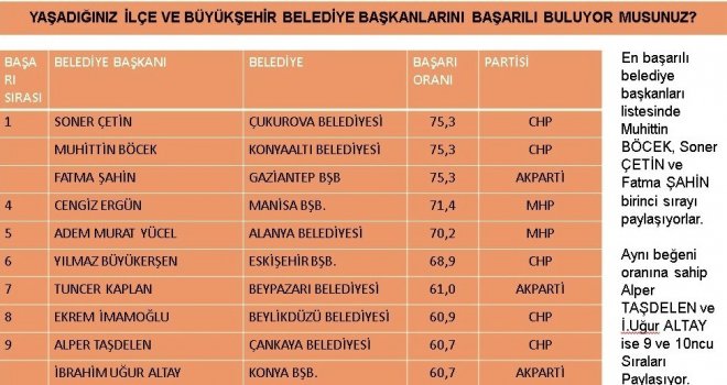 Hata payı yüzde 3 olarak açıklanan araştırmada, MHPli belediye Başkanlarından Manisa Büyükşehir Belediye Başkanı Cengiz Ergün 71.4 oranında beğeni ile dördüncü Alanya Belediye Başkanı Adem Murat yücel 70.2lik oranla beşinci sırada yer aldı. Listenin ilk onunda Ak Partili Beypazarı Belediye Başkanı Tuncer Kaplan yüzde 61.0lık oranla, CHPli Beylükdüzü Belediye Başkanı Ekrem İmamoğlu yüzde 60.9, Çankaya Belediye Başkanı Alper Taşdelen, yüzde 60.7, Ak Partili Konya Büyükşehir Belediye Başkanı İbrahim Uğur Altay, yüzde 60.7lik oranla yer aldı.
