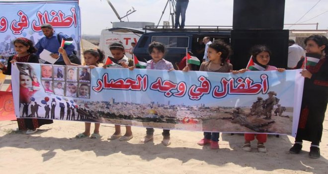 Yüzlerce Filistinli çocuk İsrailin 11 yıldır Gazzeye uyguladığı deniz ve kara ablukasını ve 30 Martta başlayan İsrailin 1948de sürgüne gönderdiği Filistinlilerin geri dönüş hakkı için yapılan gösterilerde aralarında 10larca çocuğun bulunduğu 160 kişiyi öldürmesini protesto etti.