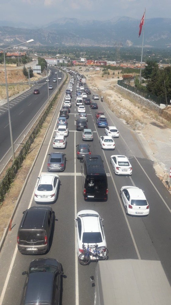 Fethiye, Bodrum, Marmaris ve çevredeki ilçelerden yola çıkan tatilciler Aydın-Denizli yolu akıllı kavşağına giden Menteşe girişinden başlayarak 10 kilometreye yakın kuyruğa neden oldu. Adım Adım ilerleyen trafik ortaya ilginç görüntüler çıkmasına neden oldu.