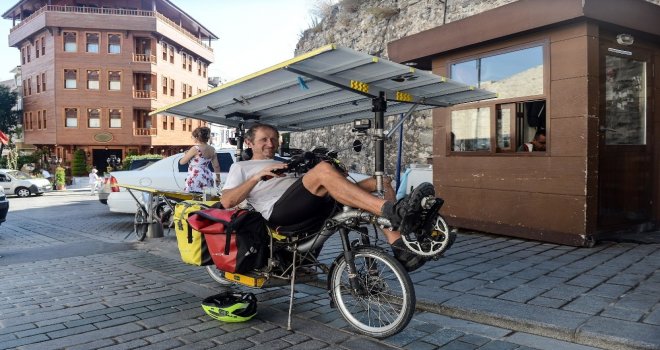 Bisikletin tamamen kendi ürettiği güneş enerjisiyle çalıştığını belirten Claude, amacının güneş enerjisi ile çok uzun mesafe yapılabileceğini göstermek olduğunu kaydetti. Fransada teknoloji mühendisi olduğunu söyleyen Claude, İstanbula ilk defa geldim dünya turumda beni en heyecanlandıran yer burası oldu. Sultanahmet Camiini özellikle çok merak ediyordum. Buradan sonraki durağım Gürcistan olacak, ardından Azerbaycan, Kazakistan ve Özbekistan üzerinden Çine kadar gideceğim. Toplamda 15 bin kilometre civarı yol yapacağım. Geleceğin araçları güneş enerjisi ile çalışacak. Böylelikle temiz enerji ile uzun yollar yapılacağını göstermeyi hedefliyorum diye konuştu.