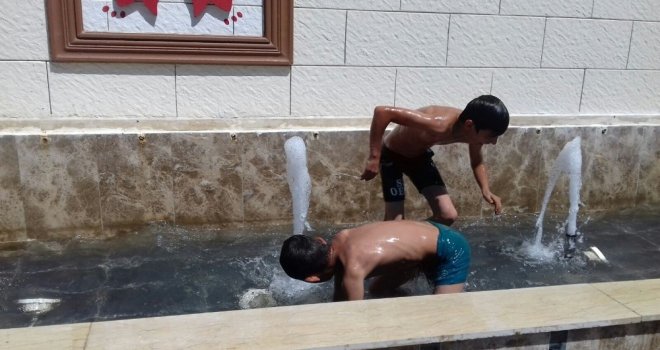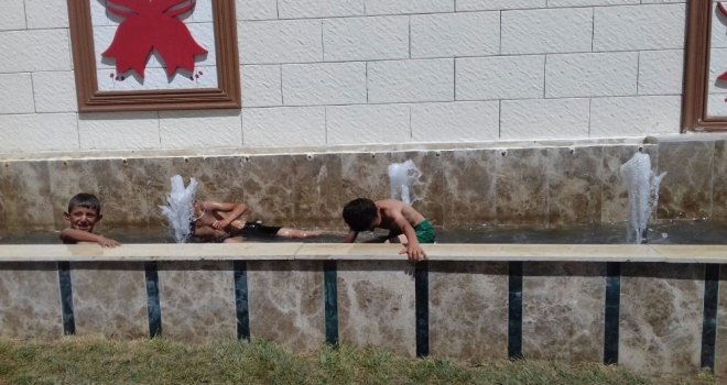 Hakkaride hava sıcaklarının 30 dereceyi bulduğu şehir merkezinde çocuklar, kent merkezindeki süs havuzları ve fıskiyelerin altına girerek serinlemeye çalışıyor.