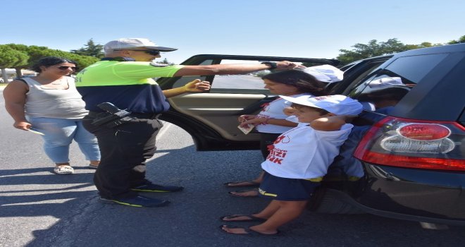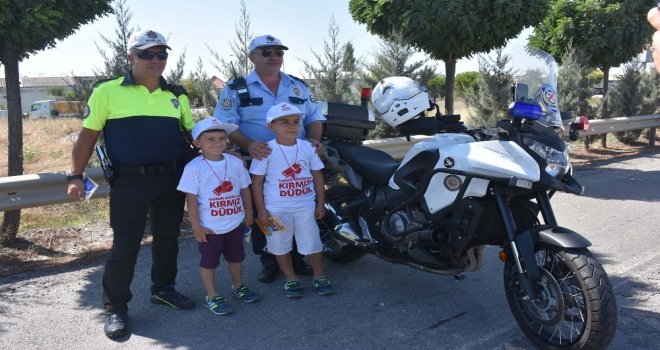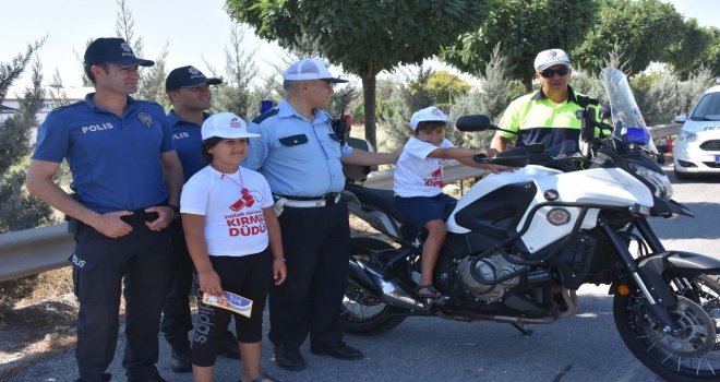 Balıkesirde Bu bayram ben de trafik polisiyim, hatalı sürücüye kırmızı düdük projesi kapsamında, araçlardaki çocuklara kırmızı düdük, tişört ve broşür dağıtıldı.