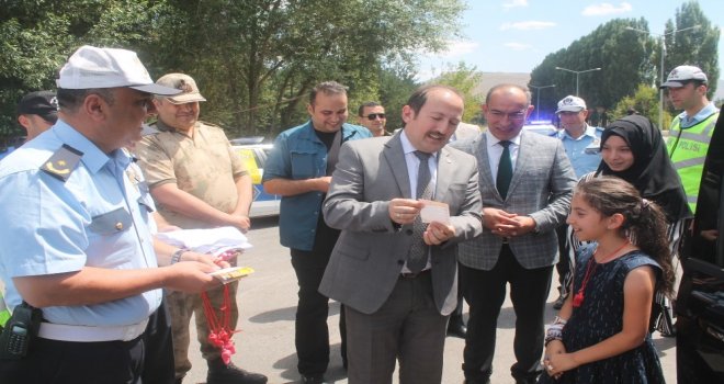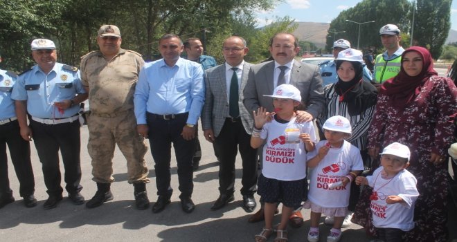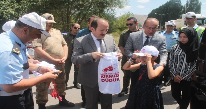 Kurban Bayramında oluşabilecek trafik kazalarının önüne geçebilmek için İçişleri Bakanlığı tarafından 81 ilde hayata geçirilen ‘Kırmızı düdük uygulaması kapsamında Bayburtta araçlardaki çocuklara kırmızı düdük, tişört ve broşür dağıtıldı.
