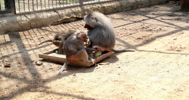 Tarsus Hayvan Parkında meyve ile beslenen hayvanlara serinletme amacıyla günlük düzenli olarak buzlu meyveler veriliyor. Elma, havuç, salatalık, muz, marul gibi meyve ve sebzelerin dondurucuda bekletilerek oluşturulduğu buzlu meyveler hayvanlara ikram ediliyor.