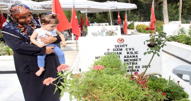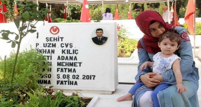 Fırat Kalkanı Harekatında çıkan çatışmada şehit düşen Uzman Çavuş Gökhan Kılıçın hiç görmediği 9 aylık kızı Zeynep Hüma annesiyle birlikte Kurban Bayramı öncesi şehitliğe gelerek babasıyla bayramlaştı.