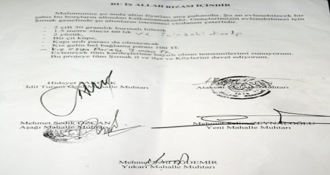 Muhtarlar, yükselen altın fiyatlarına karşın, evlenecek çiftleri ekonomik açıdan zorlayan takı takılmaması ile ilgili ortak bir karar aldı. 5 muhtarın imza attığı ortak metinde, damat adaylarından çok fazla altın ve başlık parası istendiğini ve gençlerin evlendikten sonra ekonomik sıkıntı yaşadığını belirterek,Gençlerin evlenebilmesi için Şırnak genelinde belirli miktarda altınların istenmesi vicdanen yeterlidir. denildi.