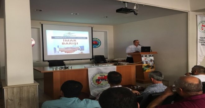 Tekirdağ DSYB Başkanı Ergin Durgun, İmar Barışı konusunun önemini anlatarak üyelerin mağdur olmaması için toplantının gerçekleştirildiğini ifade etti. Konuşmasından sonra Çevre ve Şehircilik Tekirdağ İl Müdürlüğünden elektrik mühendisi Tamer Baş, mimar Uluç Berat Körpınar ve makine mühendisi Cem Gülen tarafından toplantıya katılım sağlayan üyelere İmar Barışı kapsamında hangi yolların izlenmesi gerektiği hakkında bilgilendirme yapıldı.