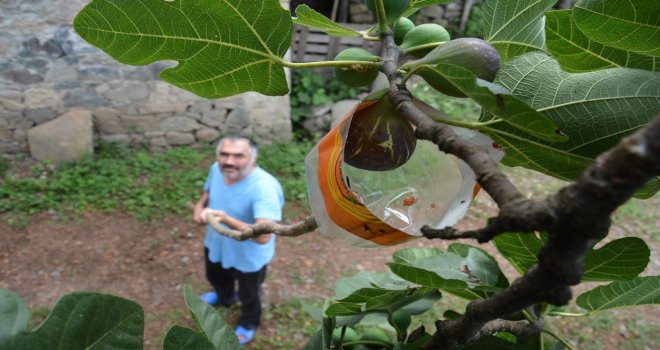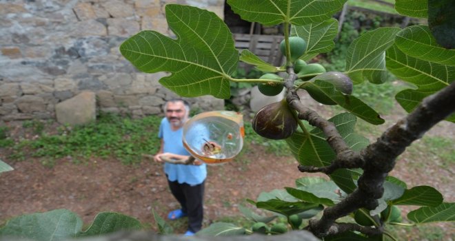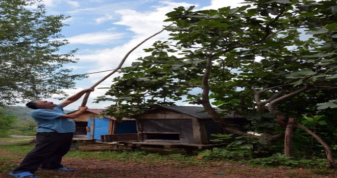 Karadenizliler ağaçların uç dallarındaki incirleri sırıkların uç kısmına çaktıkları plastik kutularla topluyor.