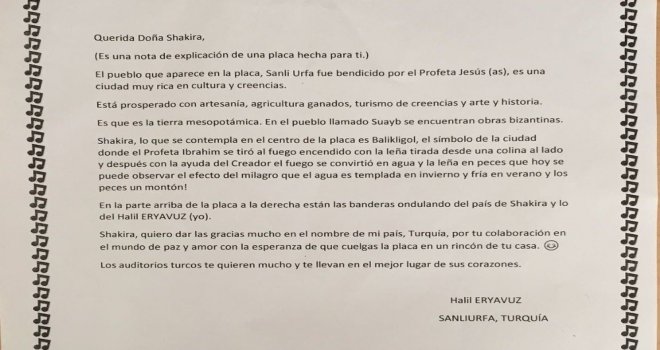 Umuda yolculuk söyledikleri bu olsa gerek. Çocukluğumdan beri yapmış olduğum çalışmaları çıkarmış olduğun albümleri takip etmekteyim. Senin bir Türk dinleyicin olarak şunları ifade etmeden geçemeyeceğim. Türkiyenin Şanlıurfa kentine özel yapılan el olarak nitelendirdiğimiz Shakira isminin yer aldığı bakır işlemeli levhanın ve kentin tanıtım videosu broşürünü şahsım tarafından sana kendi elimle vermeyi çok istiyordum. Verdiğim hediye ve mektupla dünyaca ünlü sanatçıya ülkemizin güzelliklerini anlatma fırsatı buldum. 19 Kasım Madrid konseri öncesi ya da sonrası görüşme süresi kısa olsa da yanında olabilmek, buna eğer konseri organize eden şirket yetkililerinde katkısı olursa çok mutlu olurum. Tüm dünya barışı ve sevgisi adına.