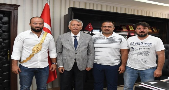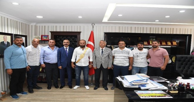 Başkan Günaydın, Okuluya Kırkpınardaki, Mehmet Yeşil Yeşile de Ispartada geçen sene başpehlivanlığı kazanmasından dolayı altın takdim etti.