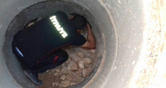 Mardinin Kızıltepe ilçesinde fosseptik borusuna düşen keçiyi kurtarmak seferber olan itfaiye erleri saatler süren çalışmalarının ardından keçiyi düştüğü çukurdan çıkardı.