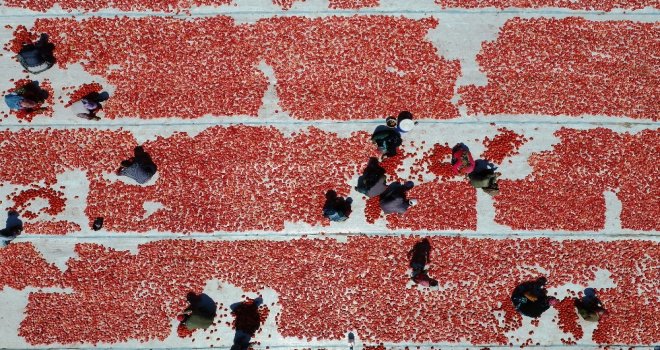 Torbalı Ovasında domates hasadının başlamasının ardından kurutmak için ayrılan domatesler tarlalara serilmeye başlandı. Serilen domatesler, Torbalı Ovasını adeta kırmızıya boyadı.