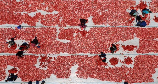 İzmirin Torbalı ilçesinde kurutulmak üzere tarlalara serilen domatesler ovaları kırmızıya bürüdü. Kurutulan domatesler Avrupa ve Amerikaya kilosu 4 eurodan ihraç edilecek.