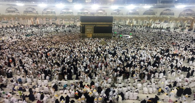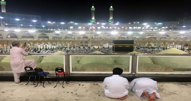 Hac ibadetini eda etmek için dünyanın dört bir yanından Mekkeye gelen Müslümanlar bayram namazı için Kabede buluştu.