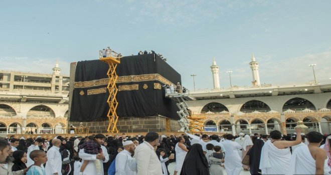 Öte yandan, Kurban Bayramı öncesi geleneksel olarak her yıl Kabenin örtüsü değiştiriliyor.