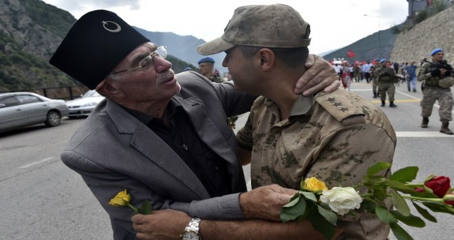 Gümüşhanenin Kürtün ilçesinde vatandaşlar, terör örgütü PKKnın sözde Karadeniz sorumlusunu operasyonla öldüren kahraman askerleri güllerle, dualarla karşıladı.