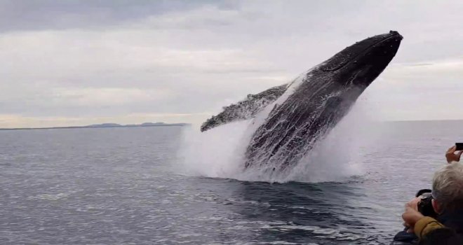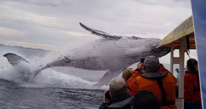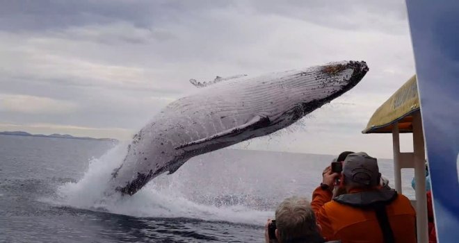 ABDnin Kalifornia eyaleti açıklarında bir gezi teknesinde çekildiği düşünülen video teknedeki insanların tanık olduğu muhteşem görüntüleri aktarıyor. Büyük kambur balina içi yolcu dolu tekneyi fark edip yakınlarına geliyor. Kambur balina tekne yakınlarında sudan çıkarak büyük atlayış gerçekleştiriyor. Atlayışını gerçekleştirirken kendi etrafında dönen balina yolcular arasında büyük hayranlık uyandırıyor.