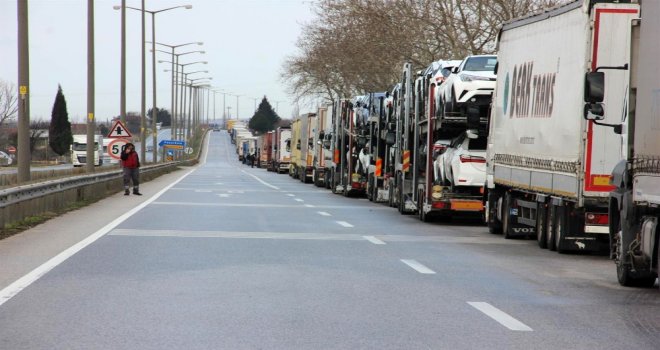Edirne Kapıkule Sınır Kapısından Bulgaristana çıkış yapmak için bekleyen tırların oluşturduğu kuyruk 13 kilometreyi aştı.