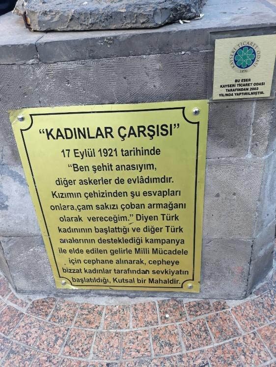 17. yüzyıla ait belgelere göre, Kale içerisindeki tarihi Kapalı Çarşıda, Uzun Çarşının başlangıcının Pervane Medresesi ile kesiştiği yer ‘Kadınlar Çarşısı olarak bilinmektedir. Buraya neden bu adın verildiğine dair bir tarihi kayıt olmamasına rağmen, bazı tarihçilere göre bu ad, 13üncü yüzyıldaki Bacıyan-ı Rumdan kalmıştır. Bacıların savaşçı genleri Milli Mücadelede de vücut bulacak, bu kez Kayserinin kadınları, savaştaki erlere yardım etmek için yaptıkları örgü ve benzeri malzemeleri burada satacaklardır. Bu cengaver kadınların anısına 2003 yılında Kayseri Ticaret Odasının öncülüğünde, üzerinde, “Ben Şehit Anasıyım. Diğer Askerler de benim evladımdır. Kızımın Çeyizinden Şu Esvapları Çam Sakızı Çoban Armağanı Olarak Vereceğim” yazılı bir kadın heykeli dikildi.