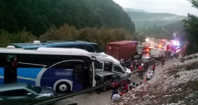 Yaralı şahıs, Ben 200 metre mesafeden gördüm tırın yolu kapattığını, kontrollü bir şekilde arabamı bariyerlere sürterek durabildim. Karşıda el sallayan insanlar vardı ben o kazaya girmektense bariyerle kırdım ve sürtürerek arabamı durdum. Sonra arkadan gelen araçlar benim arabama çarpmaya başladı yaklaşık 30- 40 tane patlama sesi duydum. Tek başınaydım Allah korudu diye konuştu.