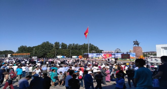 Kırgızistanın başkenti Bişkekteki Ala-Too Meydanında düzenlenen etkinlikte Kırgız halkına sağlık, mutluluk ve başarılar dileyen Bişkek Belediye Başkanı Aziz Surakmatov, başkentteki etkinlikleri başlattı.
