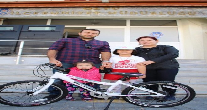 Kurban Bayramının yaklaşmasıyla yollarda oluşabilecek trafik kazalarının önlenmesi amacıyla İçişleri Bakanlığının talimatıyla 81 ilde başlatılan Bu bayram ben de trafik polisiyim, hatalı sürücüye kırmızı düdük projesine Oltudan katılan Özkan ve Burcu Aslanın 6 yaşındaki kızları Beril Aslan bisikletine kavuştu.