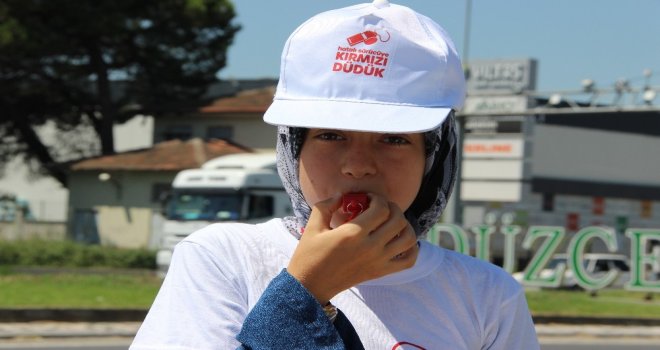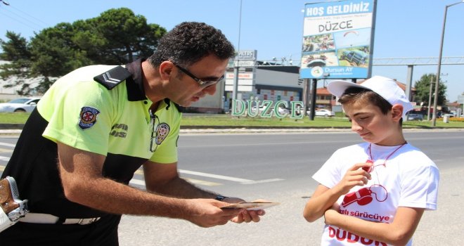 Kurban Bayramında olası trafik kazalarının önüne geçebilmek için İçişleri Bakanlığı tarafından 81 ilde hayata geçirilen ‘Kırmızı Düdük uygulaması kapsamında Düzcede araçlardaki çocuklara kırmızı düdük, tişört ve broşür dağıtıldı.