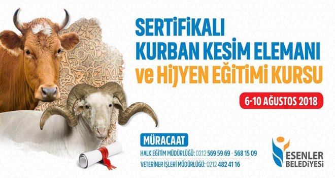 Esenler Belediyesi Veteriner İşleri Müdürlüğü tarafından Kurban Bayramında yaşanan kazaların azaltılması ve kurban kesimlerinin daha sağlıklı ve düzenli yapılabilmesi için açılan Kurban Kesim Elemanı ve Hijyen Eğitimi Kursunda kursiyerlere kurban kesimi öğretilecek. Esenler Halk Eğitimi Merkezi Müdürlüğü ile birlikte düzenlenecek ve 6 Ağustos Pazartesi günü başlayacak kursta kurban kesmek isteyenler, teorik ve uygulamalı olmak üzere 2 aşamalı eğitimden geçirilecek. Esenler Belediyesi Konferans Salonunda kurban kesimiyle ilgili teorik eğitimi alacak kursiyerler, alanlarında uzman eğitmenlerden kurban kesimiyle ilgili eğitim alacaklar. Kursiyerler, kurban kesiminin dini yönü, hijyen ve bulaşıcı hastalıklar konusunda da bilgilendirilecekler. Eğitimler, 6-10 Ağustos tarihleri arasında gerçekleştirilecek.