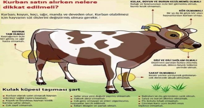 “Veteriner hekim kontrolünün olduğu güvenilir noktalardan alınmalı. Kulaklarında resmi işaretleme ve kontrollerin olduğu küpeler olmalı. Genel durumu iyi olmalı, çevresine ve uyarılara tepki vermeli, düşkün ve halsiz olmamalı. Tüy yapısı düzenli ve parlak olmalı. Sağlıklı, azaları tam ve besili olmalı. Fiziki görünüşlerinde olumsuzluk ve anormallik bulunmamalı. Ağız ve burun kısımlarında salya, yara, akıntı bulunmamalı. Vücutta geniş yara, şişlik ve ödem bulunmamalı. Vücudunda ve eklemlerinde çeşitli yara, apse ve şişkinlikler bulunmamalı. Kondisyonu iyi, yuvarlak hatlı olmalı, vücutta kemik çıkıntıları fark edilmemeli, çok zayıf olması çeşitli hastalıklara maruz kaldığının ya da bakım şartlarının iyi olmadığının belirtisi olabilir. İshal olması da çeşitli hastalıkların belirtisi olabileceğinden, arka kısmının ıslak olmaması gerekir. Sığır ve Manda 2, koyun ve keçi 1 yaşını doldurunca kurbanlık için uygundur. Kurbanlık için dişi değil, erkek hayvan tercih edilmesi hem dinimizce hem de ülkemizin hayvancılık politikaları gereği uygundur denildi.”