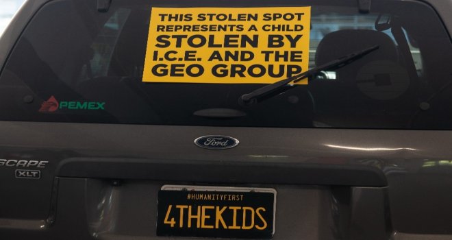 Protestocular, aynı zamanda The GEO Grup çalışanlarına karşı da sivil itaatsizlik eylemi yaptı. İş yerleri açılmadan önce şirkete ait park yerlerini araçları ile kapatan protestocular, park yerinde bulunan araçların plakalarını çocuklar için anlamına gelen “4THEKIDS” plakaları ile değiştirip araçların üzerine “Bu park noktası ICE ve GEO Grup tarafından çalınan bir çocuğu temsil ediyor” yazılı pankartlar bıraktı. Önce İnsanlık Koalisyonu ve Gelişim için California toplulukları üyesi Rachel Carson, yapılan eylemle ilgili olarak “GEO Grupun burada yeri var ve insanların bunu bilmesini istiyoruz. Bugün geldik ve onların yerlerini aldık, her bir nokta bir çocuğu temsil ediyor” dedi.