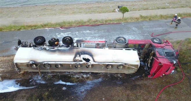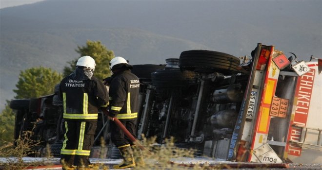 Bursanın Orhangazi ilçesinde metanol yüklü tanker devrilerek alev aldı. Patlamalar tankerde yarıklar oluştururken, itfaiye ekipleri sürekli alev alan metanol tamamen boşalana kadar yangına köpükle müdahale etti. Kaza sırasında araçtan atlayan sürücü ise yaralandı.