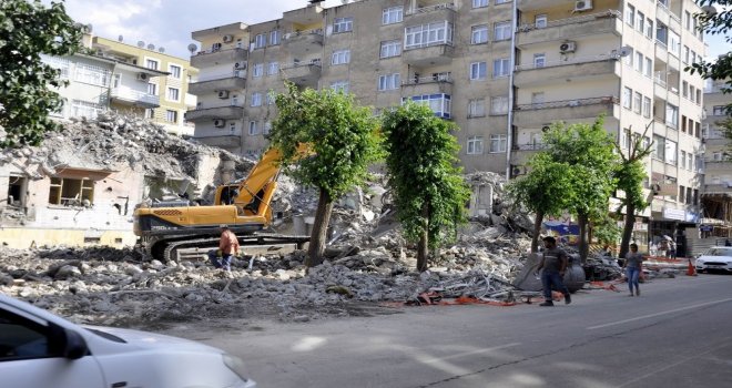 Diyarbakırın Yenişehir ilçesi Ofis Semtinde iş makineleri ile yıkılan binanın molozları ağaçlara zarar verdi.