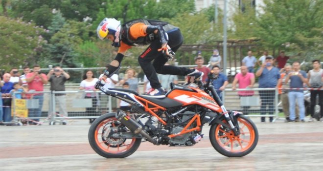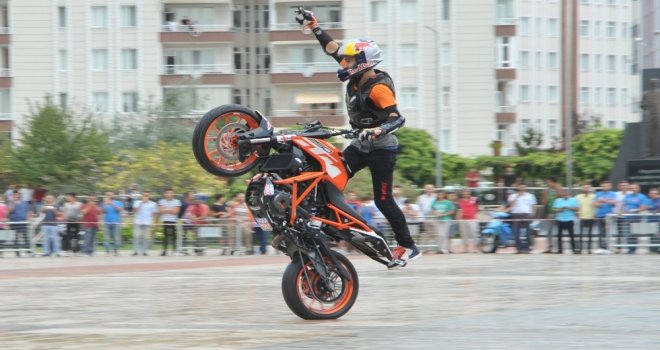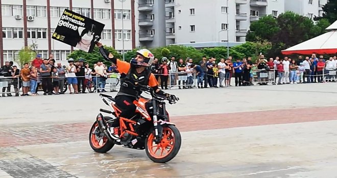 İlçe Emniyet Müdürünün konuşmasının ardından Birkan Polatın stunt gösterisi izleyenlere zevkli ve heyecanlı dakikalar yaşattı. Motosikletle yaptığı bir birinden ilginç gösteriler ile izleyenleri büyüledi. Polat gösterisi esnasında yağan yağmur nedeniyle ıslanan zeminde motosikletin kayması sonucu yere düşerek yürekleri ağza getirdi. Yere düşen akrobasi cambazı Birkan Polat kalkarak gösterisine devam etti. Gösterisi esnasında taşıdığı Bana Yapılanları Görmezden Gelme” pankartı büyük alkış aldı. Gösterisini tamamlayan Birkan Polat, hayranlarına posterini imzalayarak verdi.