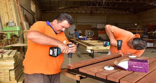 Muratpaşa Belediyesinin Park Bahçeler Müdürlüğü ahşap atölyesi, kent mobilyaları üretimini sürdürüyor.