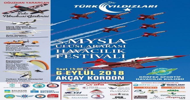Bu yıl 5.si düzenlenen Mysia Uluslararası Havacılık Festivaline Balıkesirin Edremit ilçesi ev sahipliği yapacak. 6 Eylül saat 15.00da Akçay koordonda havacılık gösterileri meraklıları tarafından izlenebilecek. Festival kapsamında 28 sivil uçak, 3 gyrocopter, 5 paramotor ve yelken kanatlar gösteri uçuşları yapacak. Festivalin finalinde ise Türk Yıldızları 7 uçak ile gösteriye imza atacak. Türk Yıldızları dışında Oğuzhan Yararcan ve Mustafa Gürer de uçakları ile akrobasi gösterileri sunacaklar. Onbinlerce kişinin izlemesi beklenen ve bu yıl 5.si düzenlenen Mysia Uluslararası Havacılık Festivali ayrıca uçuş okullarına da ev sahipliği yapacak.