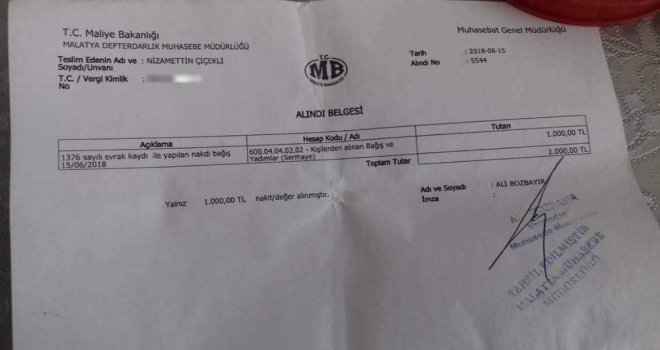 Malatyada yaşayan memur emeklisi Nizamettin Çiçekli, Türkiyeye ekonomi üzerinden oynanan oyunlara karşı aldığı emekli ikramiyesini devlete geri verdi.