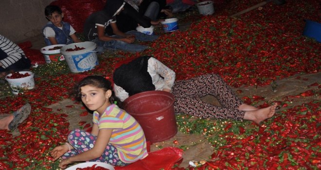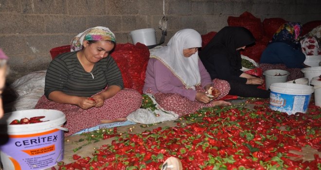 Kırmızı biberiyle ün yapan Gaziantepin İslahiye ilçesinde biber hasadının başlaması ile birlikte bölgede yaşayan kadınlar ev ekonomisine katkıda bulunuyor. Acıdan para kazanan kadınlar, biberlerin kilosunu 45 kuruştan temizliyor.