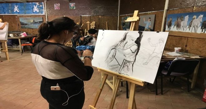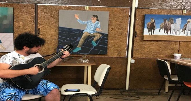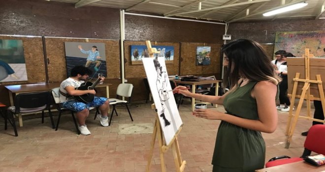 3 ay önce kursa başlayan Çağla Çizo, arkadaşının hem modellik yaptığını hem de gitar çaldığını belirterek, “Resim ilgim benim ilkokul zamanlarında başlamıştı, 6 yıldır resim yapıyorum. Burayla sergi sayesinde tanıştım, iletişim kurdum, sonra buraya geldim. Öyle devam ediyorum şu anda. 3 aydır kurs eğitimi görüyorum. Arkadaşımızı buraya çağırdık, zaten kendisi gitar çalıyordu. Hem bize modellik yapıyor hem de gitar çalıyor. Bu şekilde sanatları birleştirmek olduk” dedi.