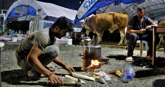 Kurban Bayramına sayılı günler kala kurban pazarları hareketlenmeye başlarken, Türkiyenin dört bir yanından İstanbula gelen besiciler, gözü gibi baktıkları hayvanları ile birlikte uyuyor, aynı çadırda yemek pişiriyor ve 24 saat başlarında nöbet tutuyor.